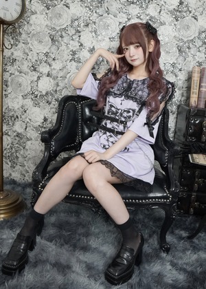 A gothic-style oversized T-shirt featuring a bold ribbon print. Instantly elevate your outfit with the included harness accented with a removable chain. The detachable lace collar with studs and slightly sexy shoulder cut-outs make this a must-have piece that looks cute from every angle.