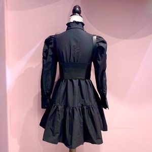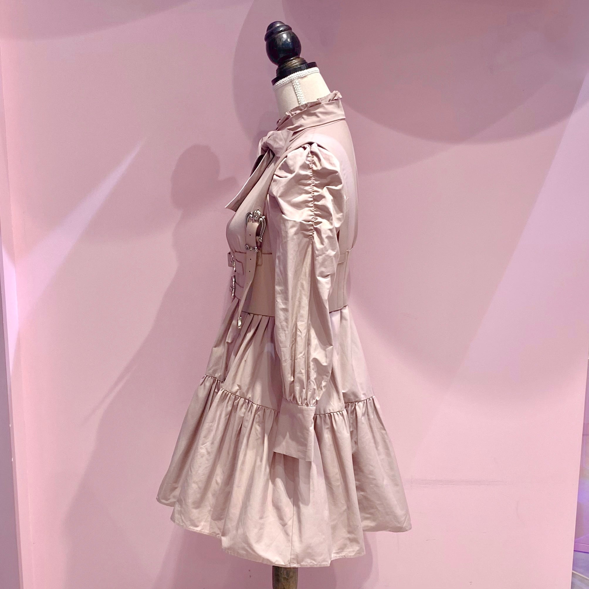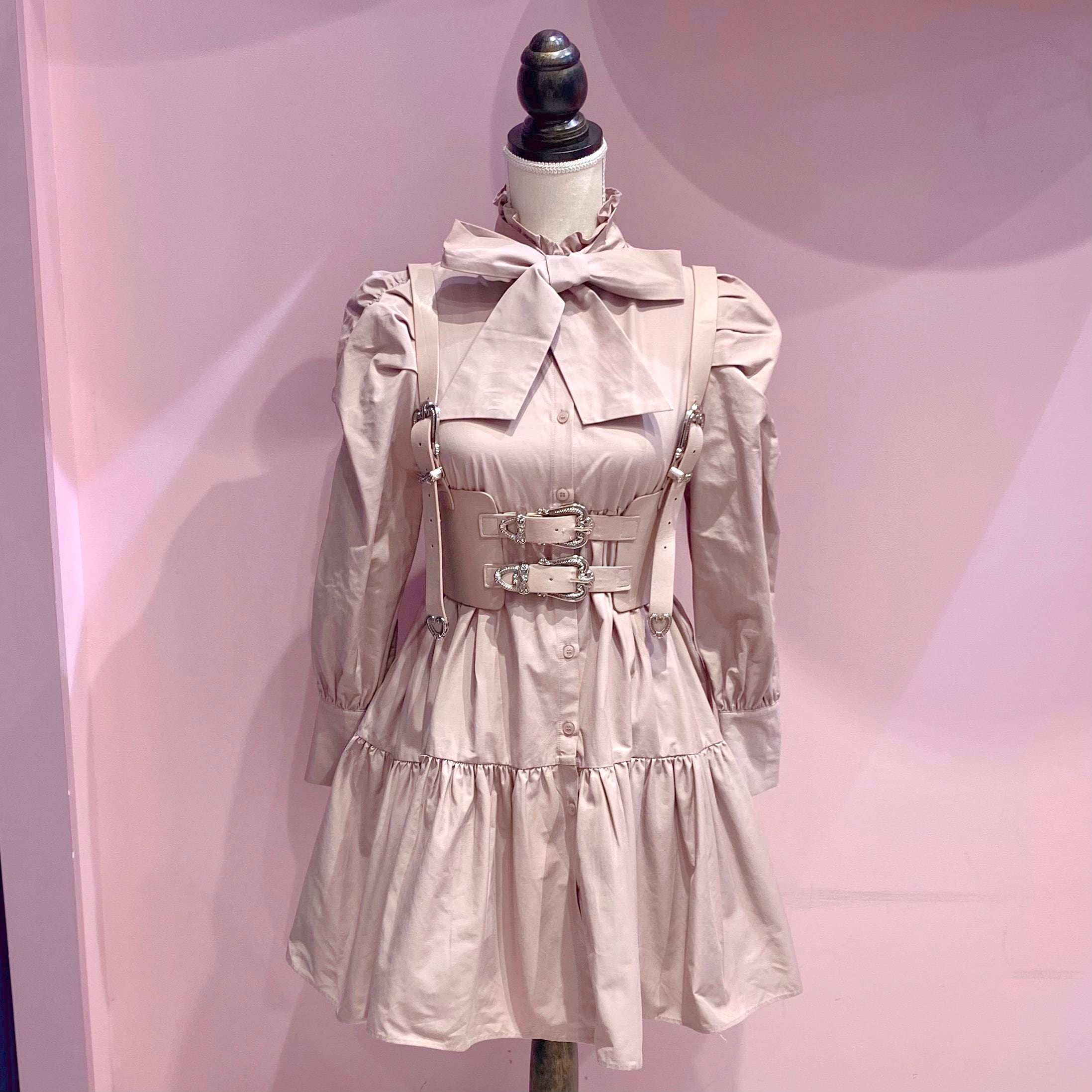 大きな首元のリボンが印象的なハーネス付きワンピース。重厚感のあるシルバーバックルを使用したカラーレザーのクールなハーネスでおしゃれでモダンなデザインに。ワンピースはゆったりスモックデザインでカジュアルに着こなしても◎