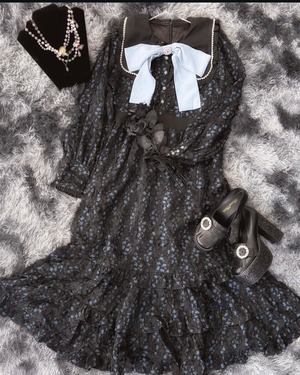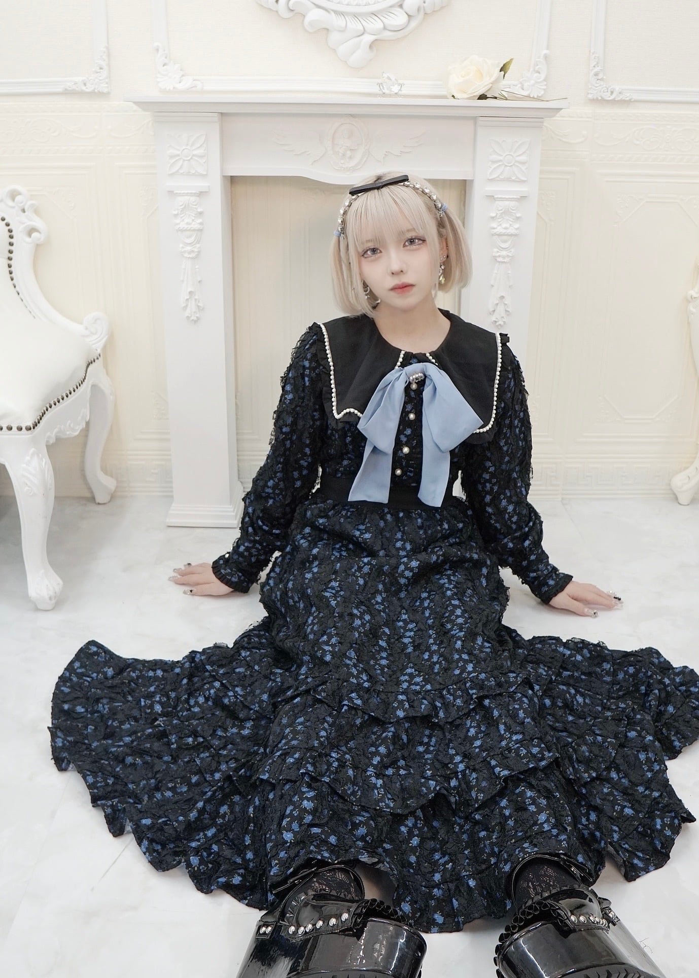 A cute long dress with a doll-like design using plenty of floral patterns and lace fabric.