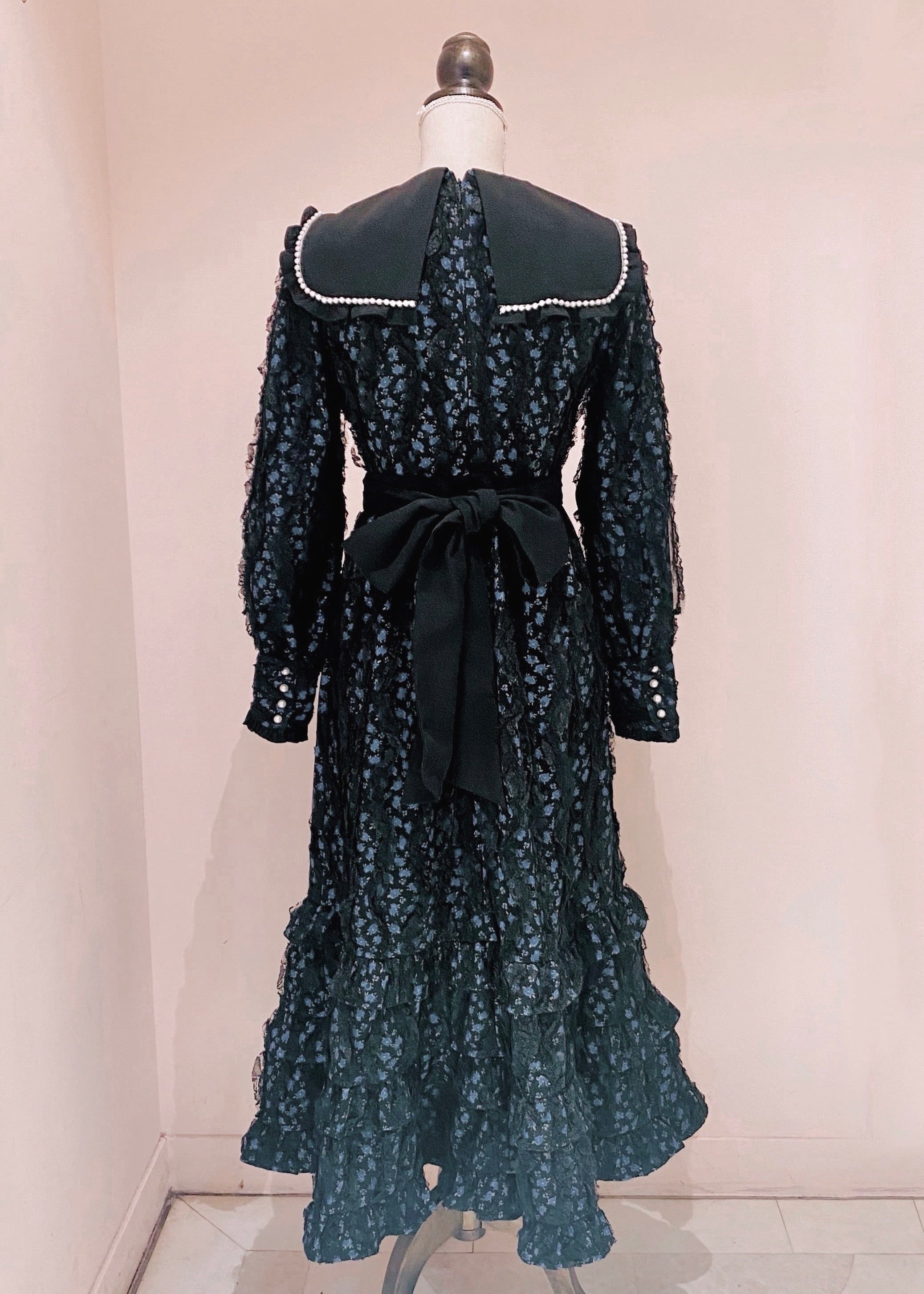 たっぷりの花柄とレース生地を使用したお人形さんのようなデザインの大人可愛いロングワンピース 。