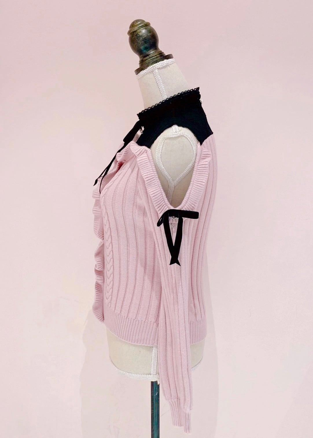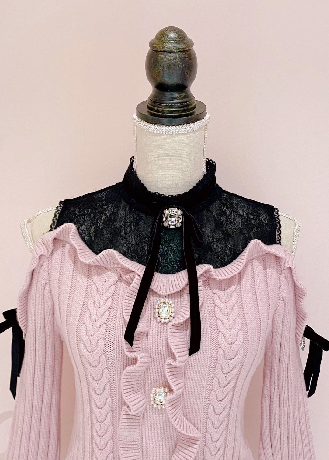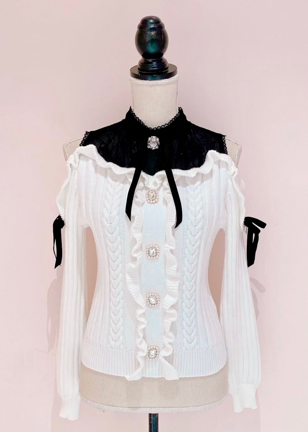 Petit sexy lace cable knit tops. The off-the-shoulder design gives you a cute look. Add a touch of glamor with sparkling bijou pearl buttons and velor ribbon.