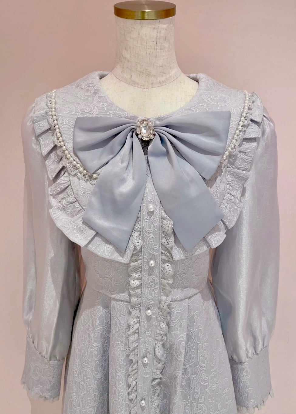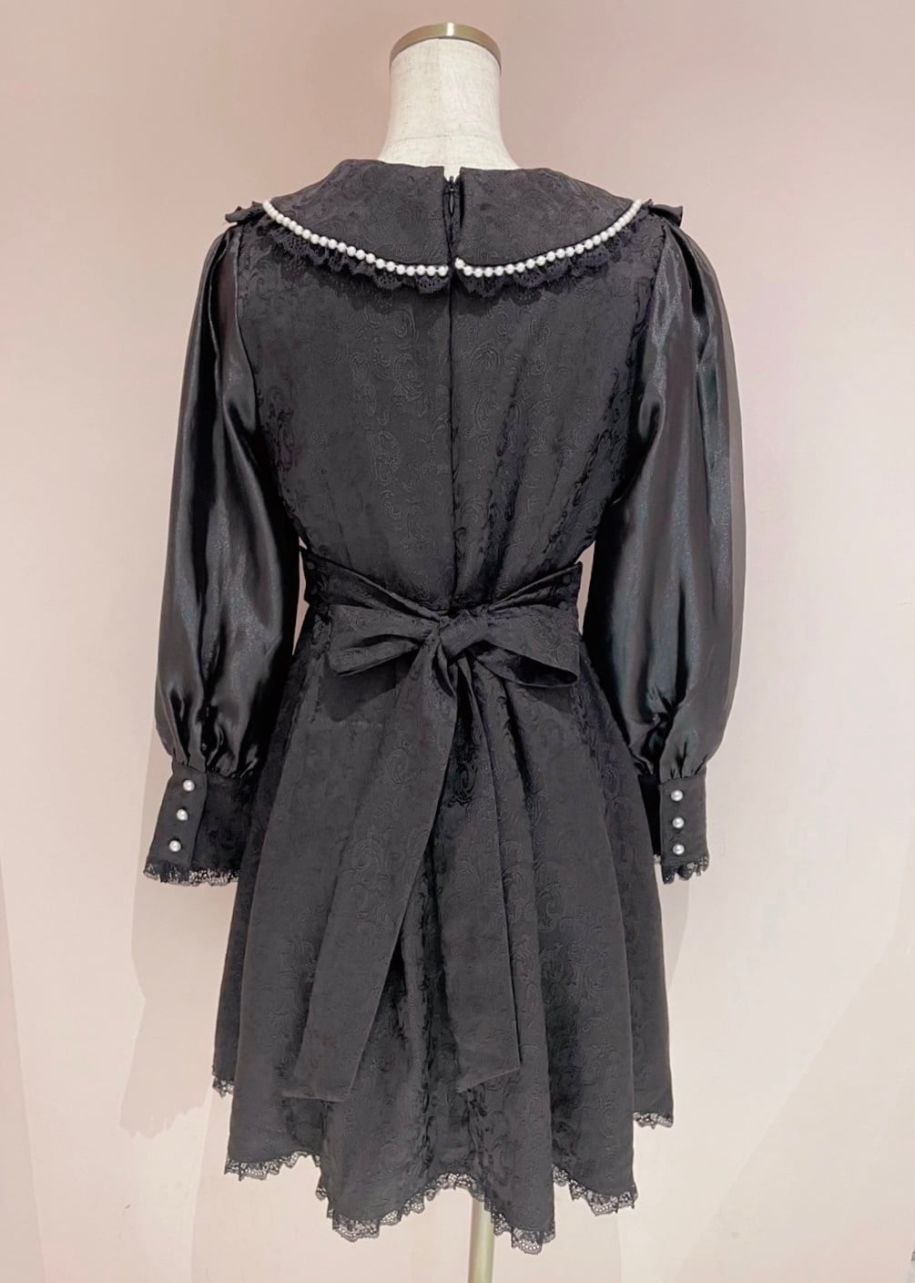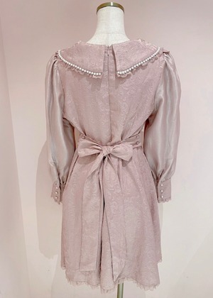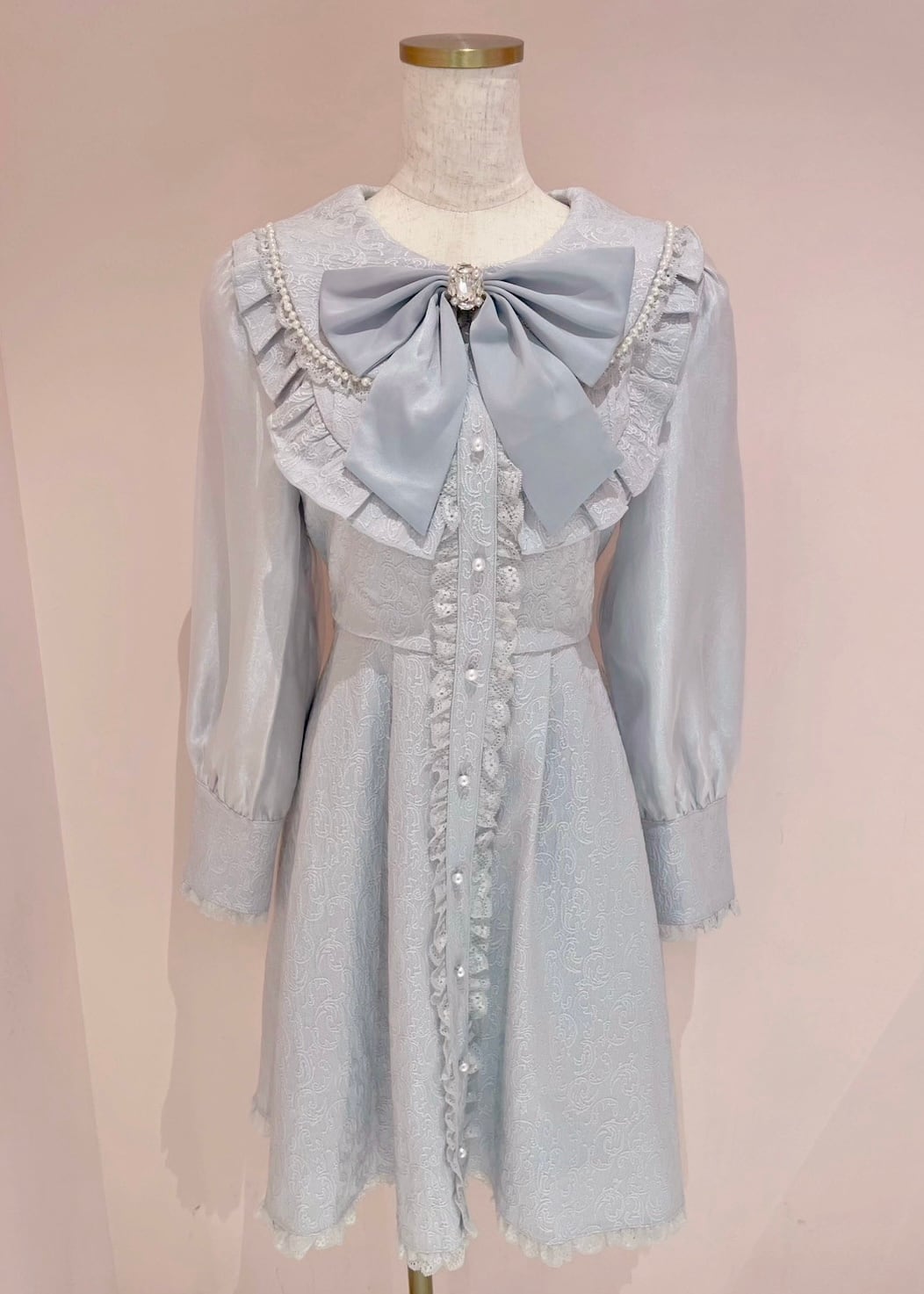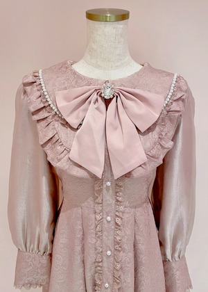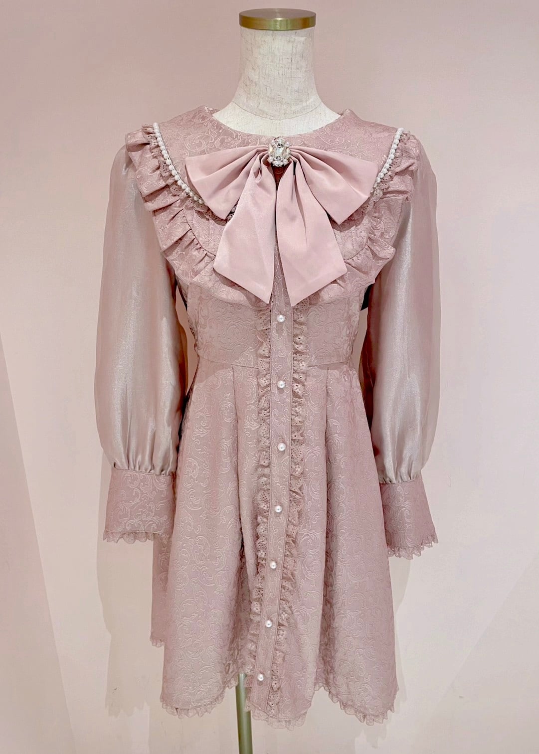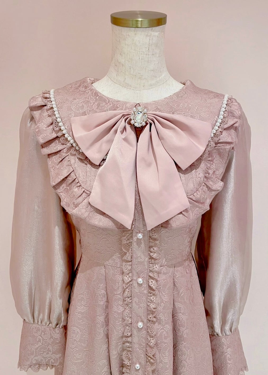 A dress made of luxurious jacquard material. Pearls around the collar and buttons add a touch of glamour. The sheer organza material used for the sleeves adds a light touch without being too heavy, making it a versatile piece that can be worn from autumn to spring.
