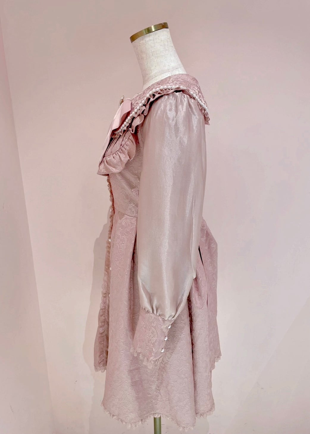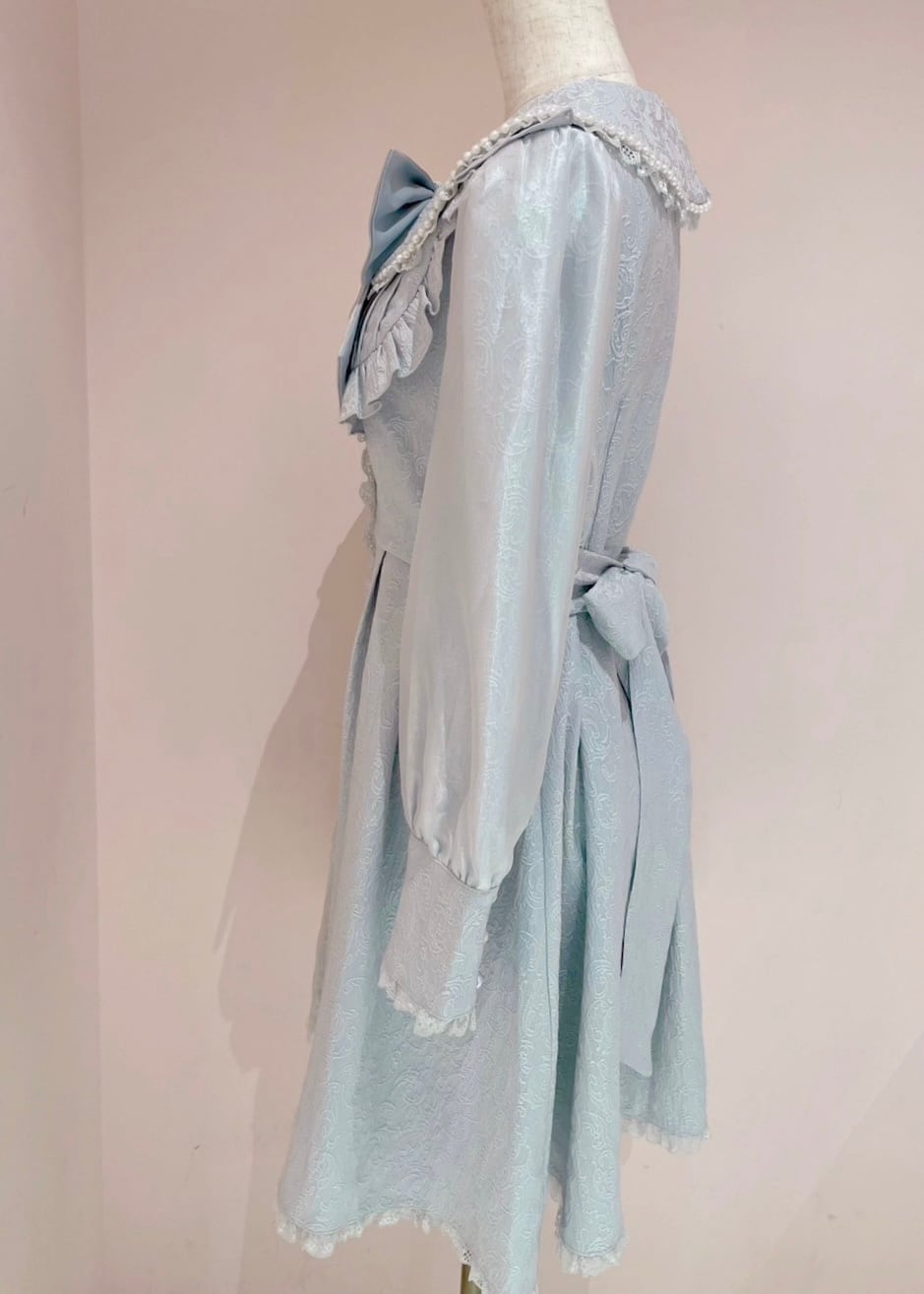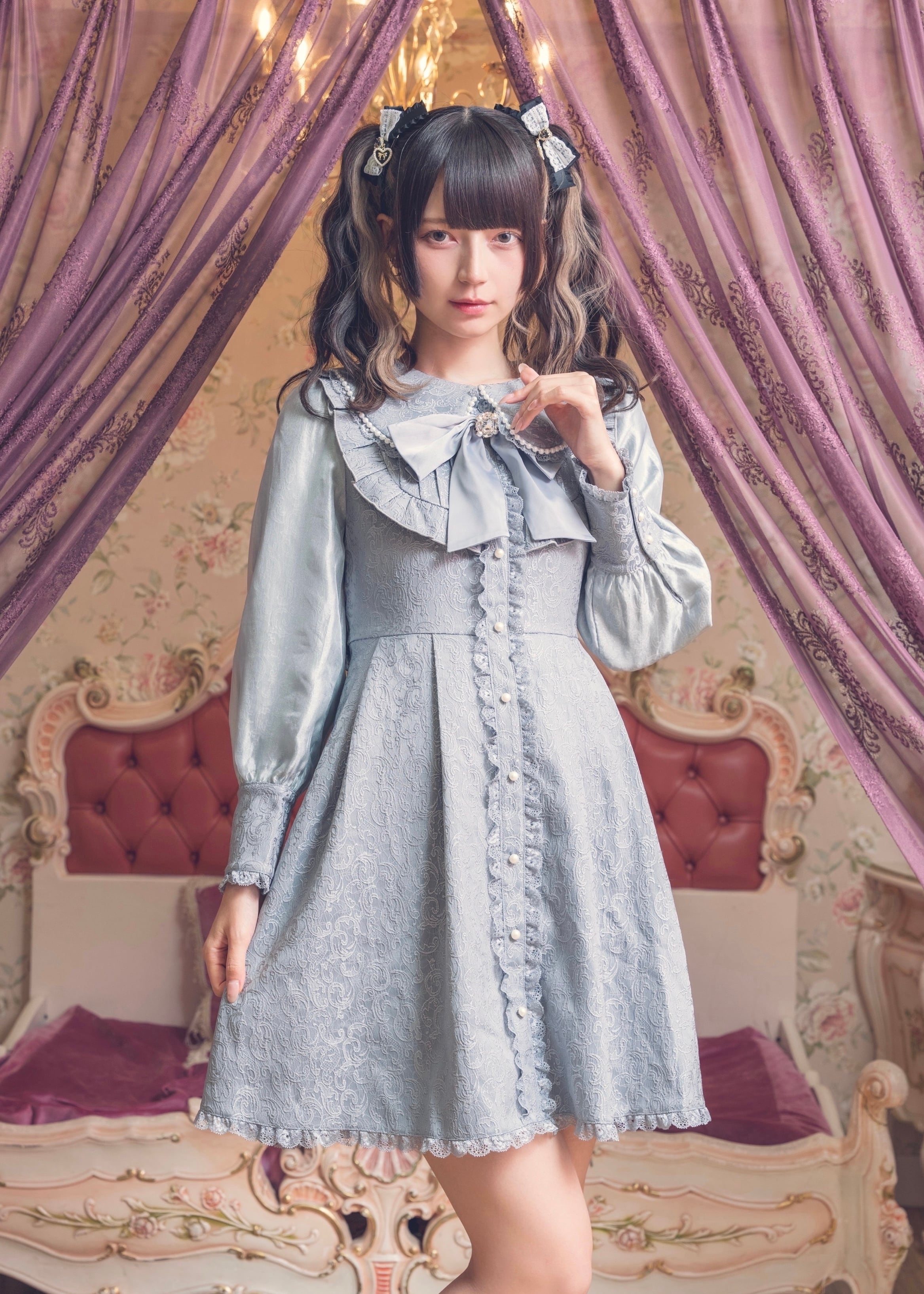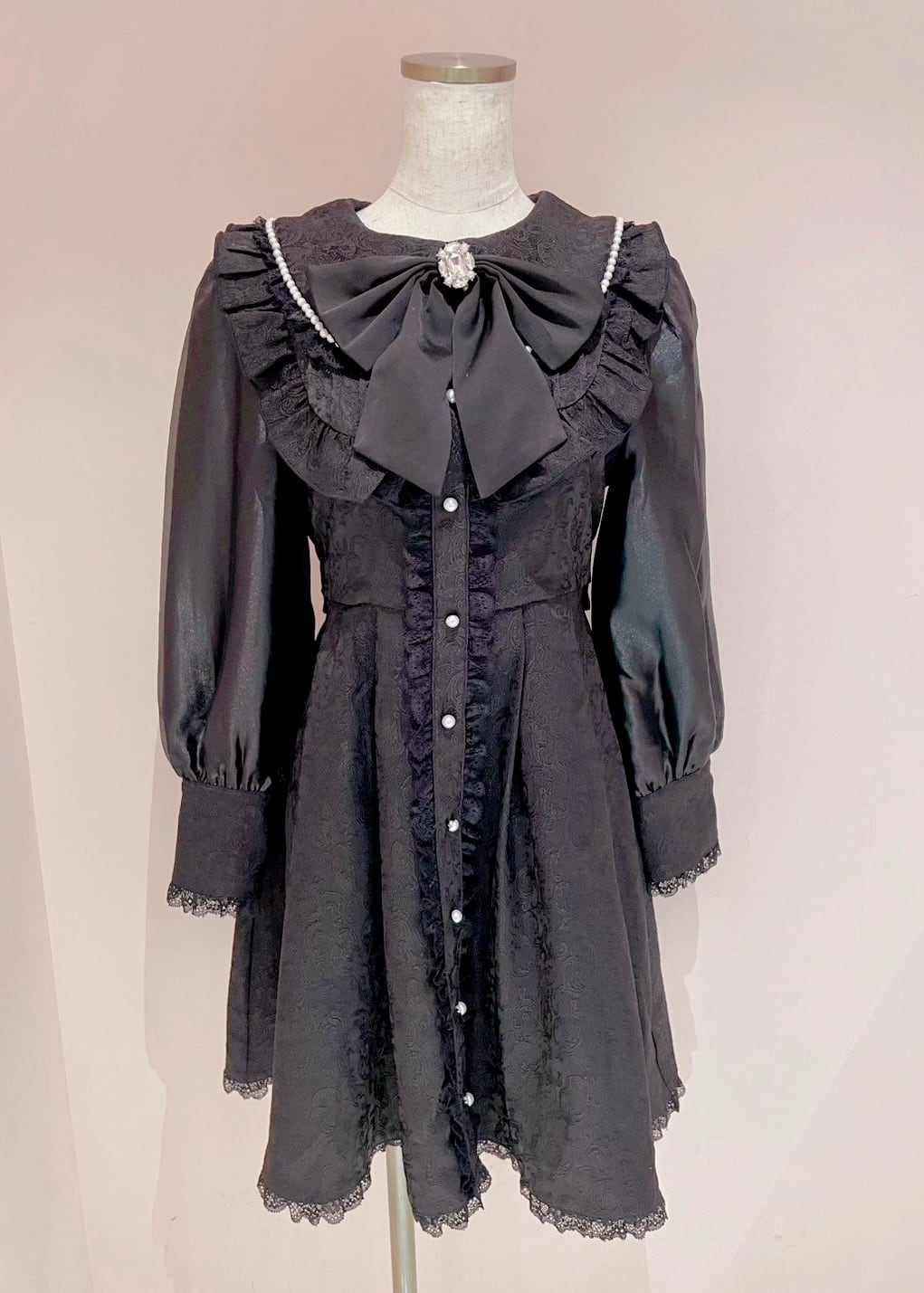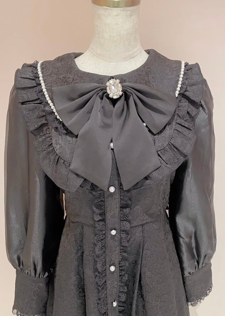 A dress made of luxurious jacquard material. Pearls around the collar and buttons add a touch of glamour. The sheer organza material used for the sleeves adds a light touch without being too heavy, making it a versatile piece that can be worn from autumn to spring.