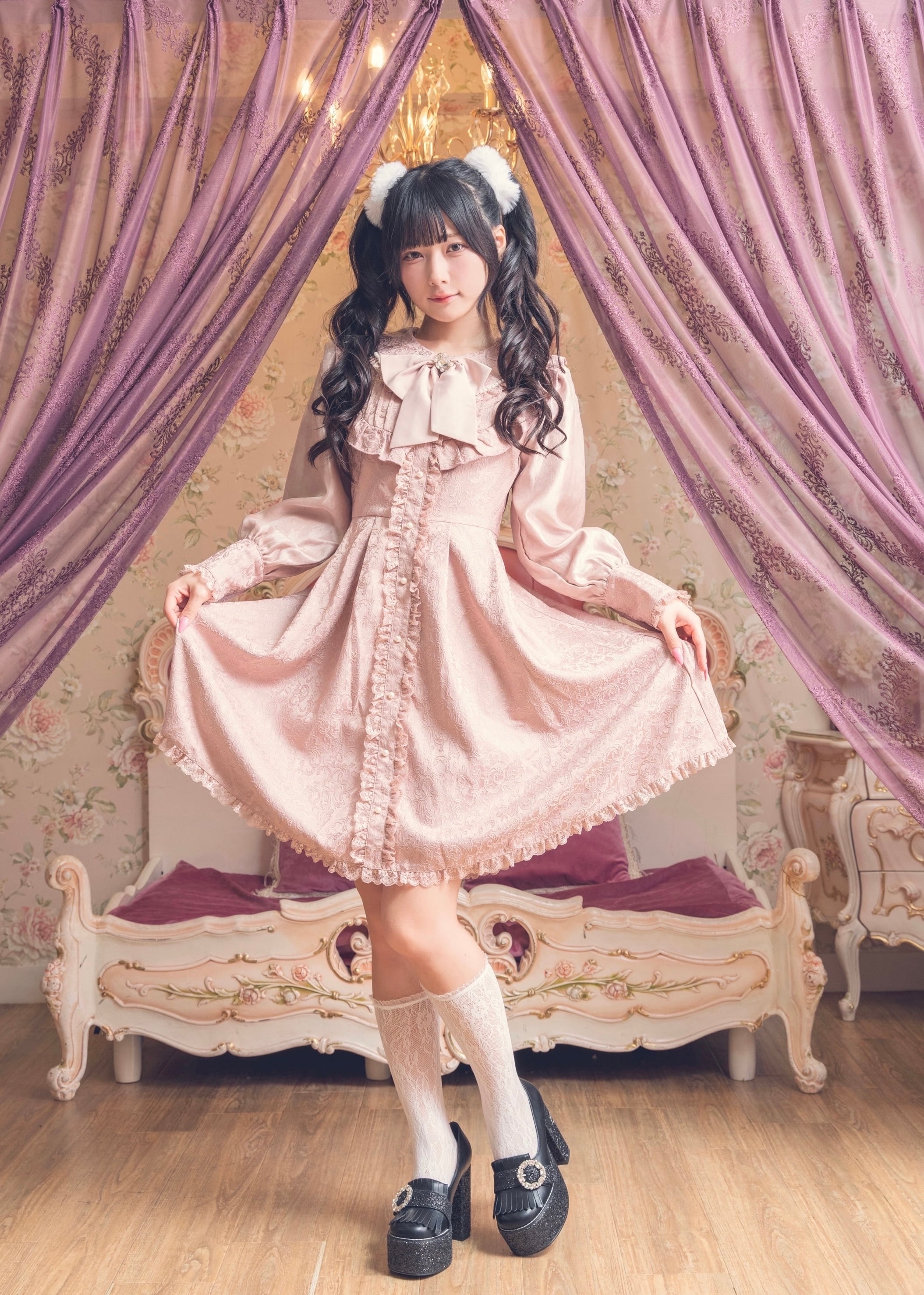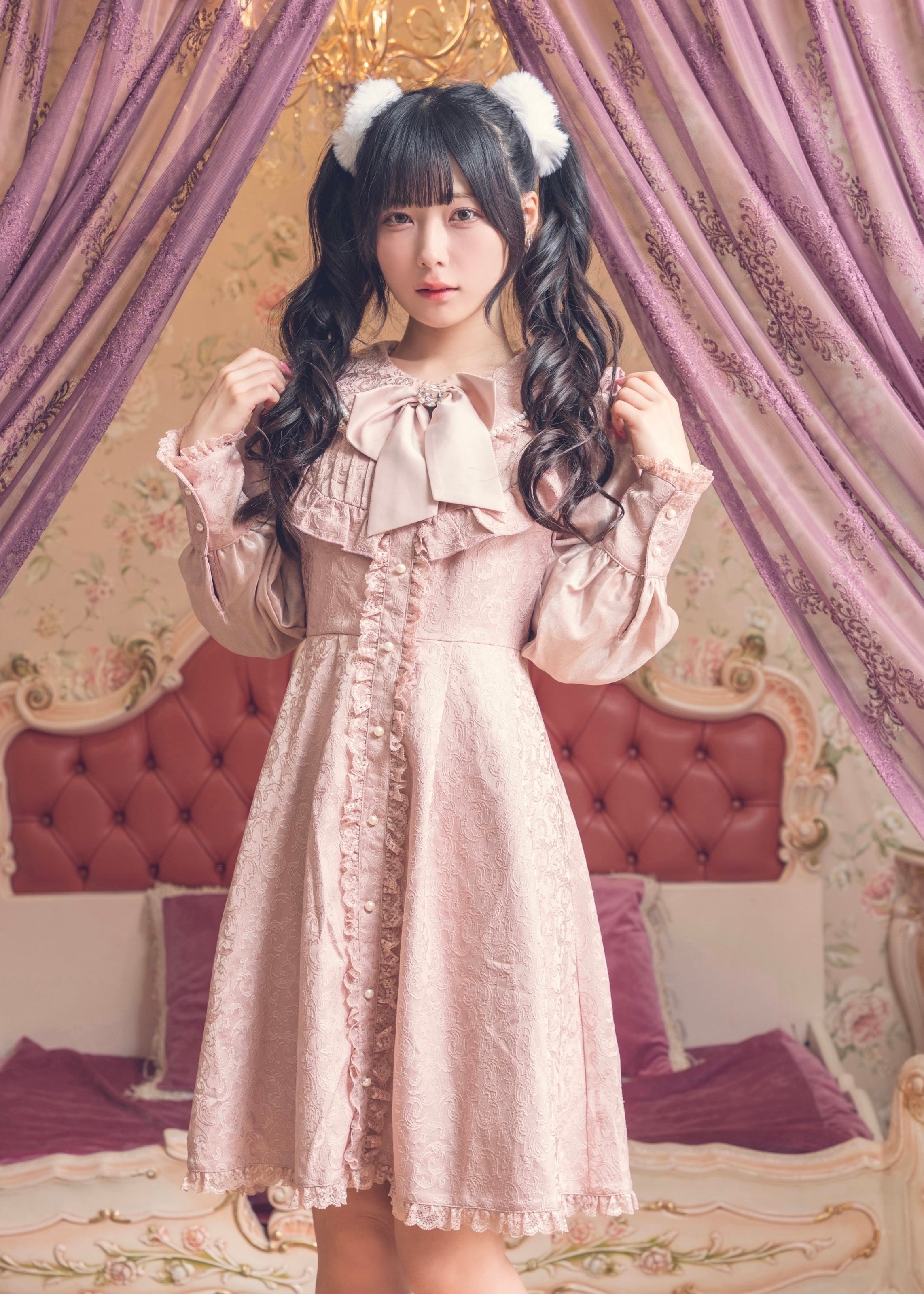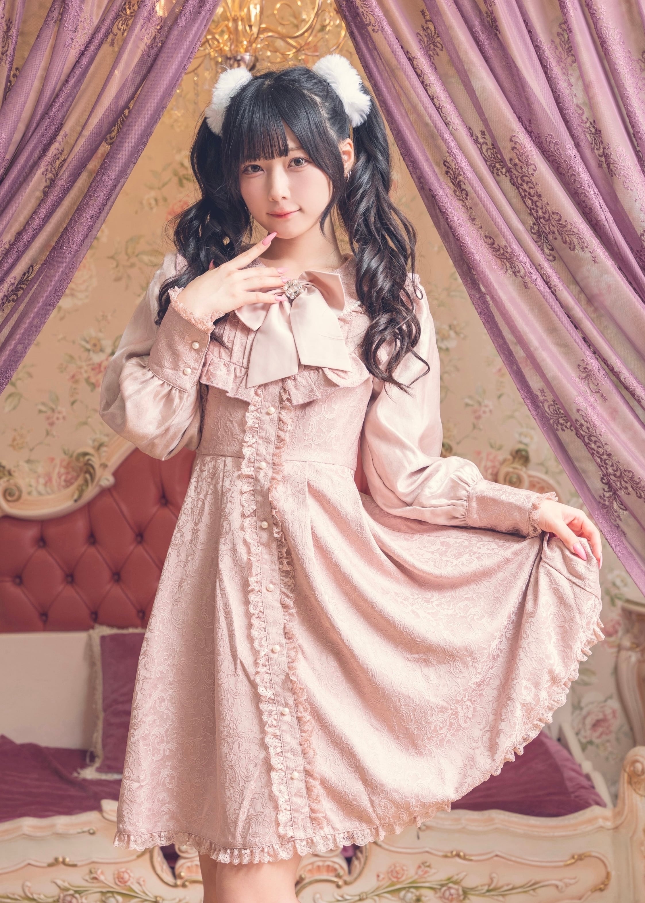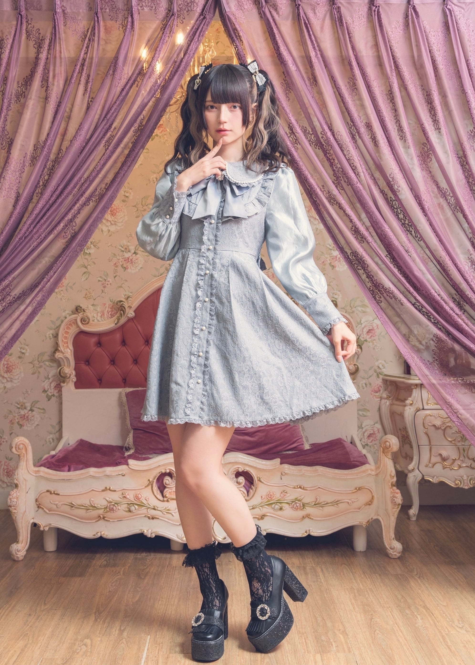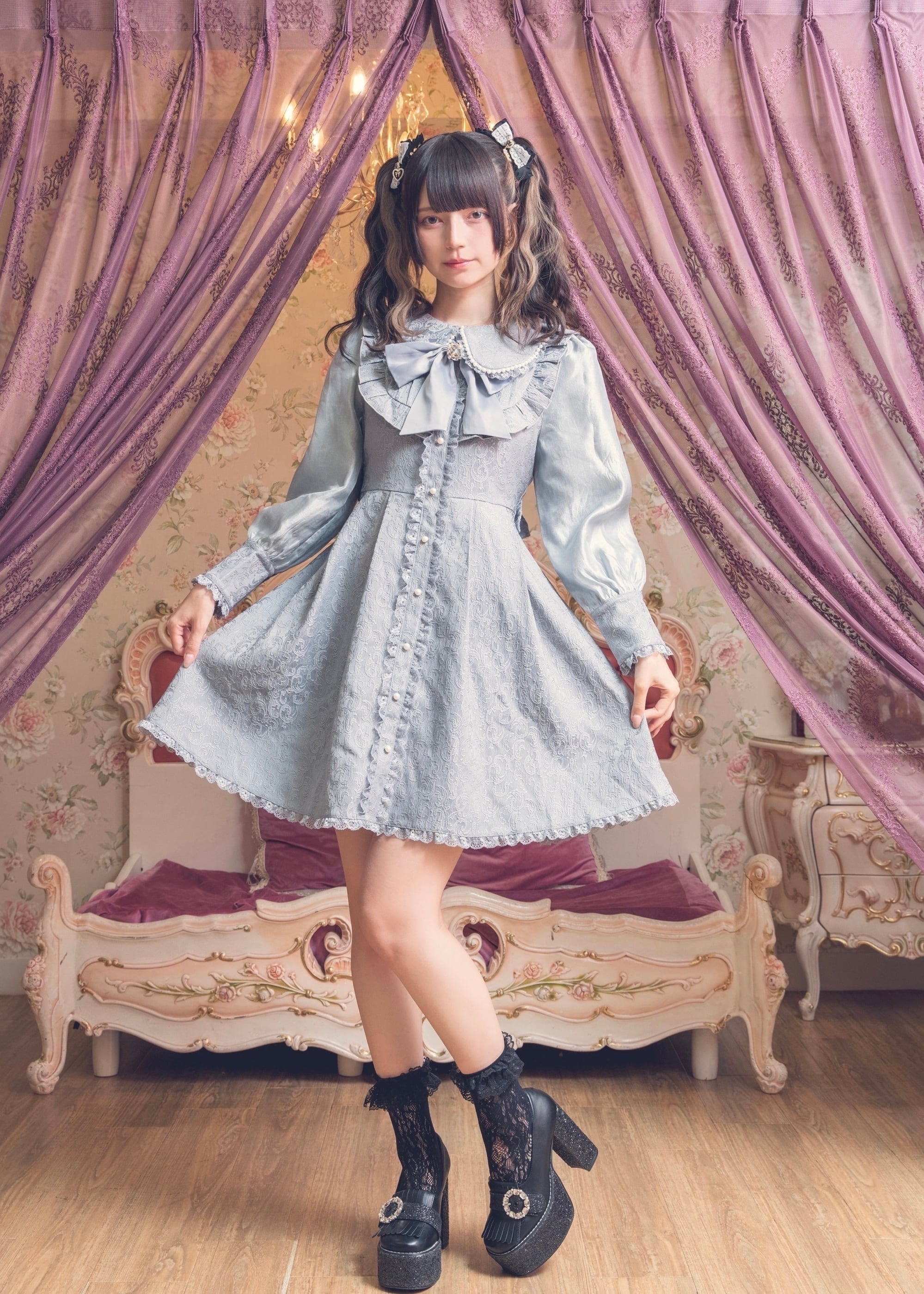A dress made of luxurious jacquard material. Pearls around the collar and buttons add a touch of glamour. The sheer organza material used for the sleeves adds a light touch without being too heavy, making it a versatile piece that can be worn from autumn to spring.