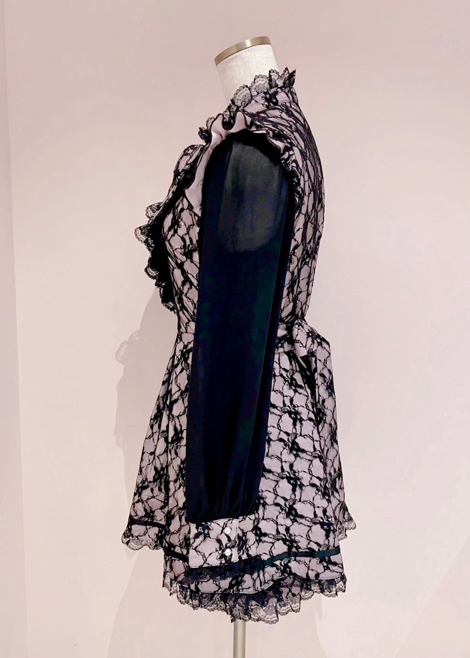 たっぷりとしたフロントフリルと取り外し可能な大きめリボンがクラシカルなオールインワン。